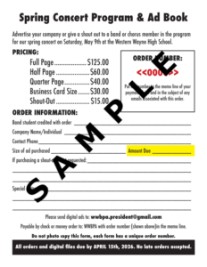 Band and Color Guard members are selling ads for the Spring Concert program & ad book. Students should pick up numbered forms in the band room.